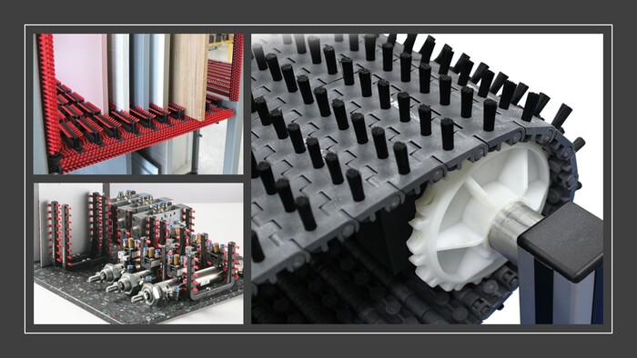ブラシがワークを浮かせて支持するため、ゴミや切り屑を排出して擦り傷を防止するとともに、ブラシの柔軟さによって打痕のようなキズを防止します。また、構成部品のほとんどが樹脂製のため、水に強く洗浄工程や水分を多く含むワークにも適している点も見逃せません。