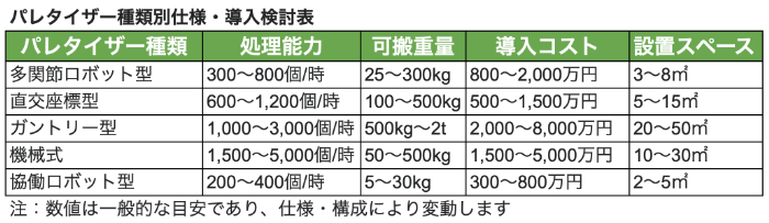 以下の表は、(1)〜(5)までの各パレタイザーの仕様について、種類別にまとめたものです。
