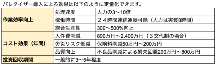 パレタイザーを導入することで、企業は多くのメリットを得られます。 特に、作業の効率化や労働環境の安全性向上、コスト削減が挙げられ、現場の課題解決に直結しています。