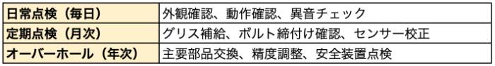 パレタイザーの安定稼働には、計画的な保全活動が不可欠です。一般的に稼働率目標は95%以上とされ、年間保全費用は導入費用の5〜8%程度を見込む必要があります。